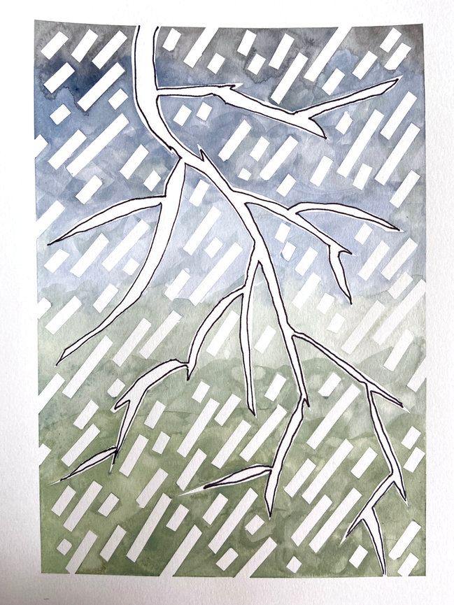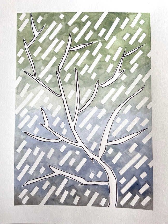 I used our exercises with line, combined with one of the line exercise prompts (tape) to unify the pieces loosely. My materials were mainly Bristol board, gouache, and ink. I have peppered in photos of my experience this week using non-traditional materials to make marks.