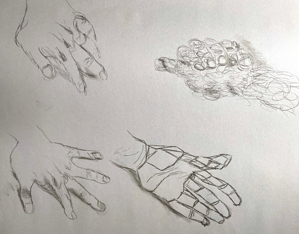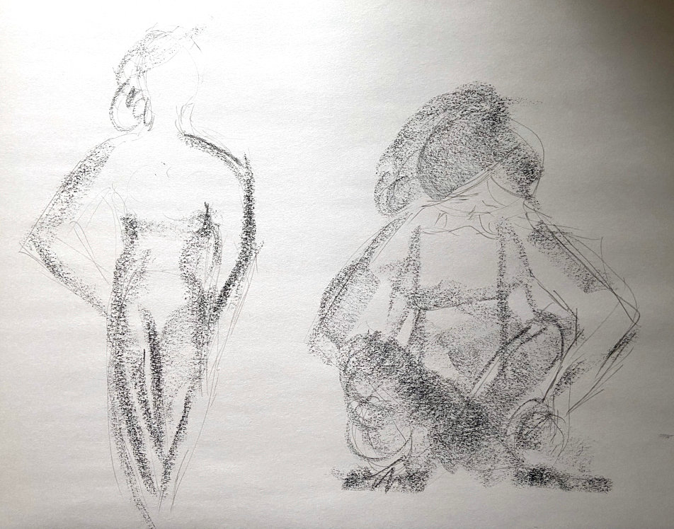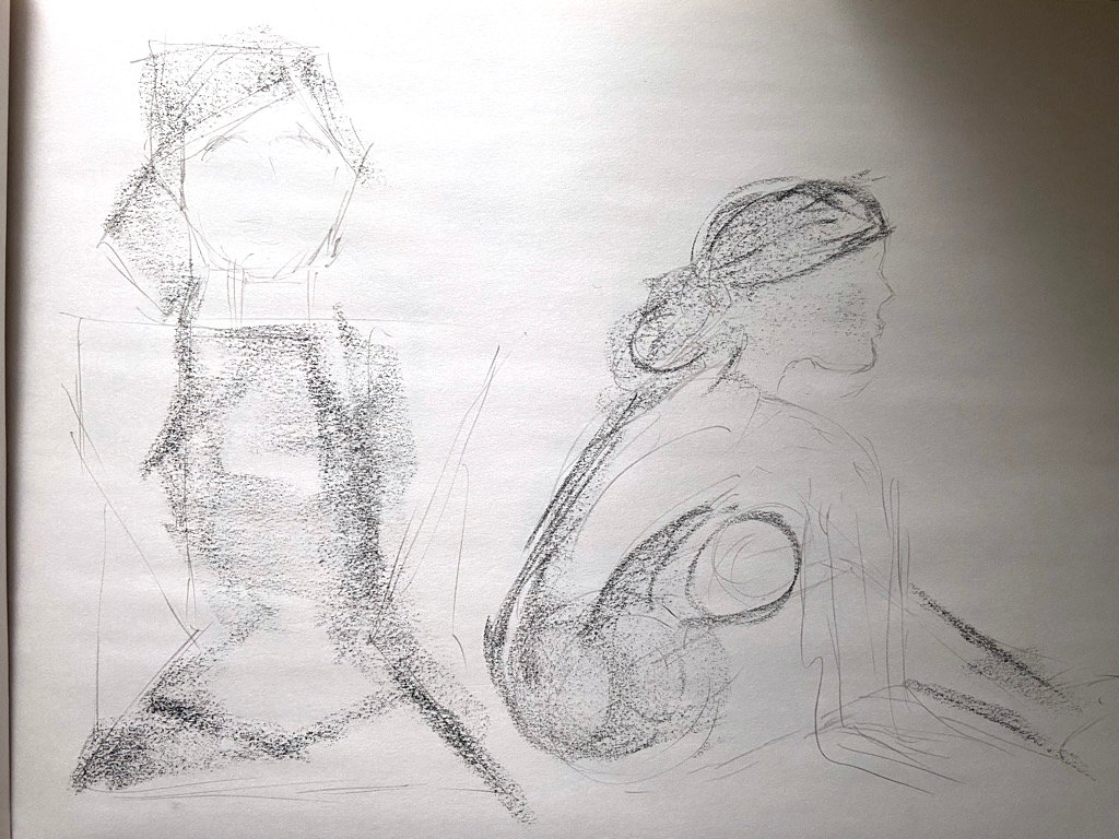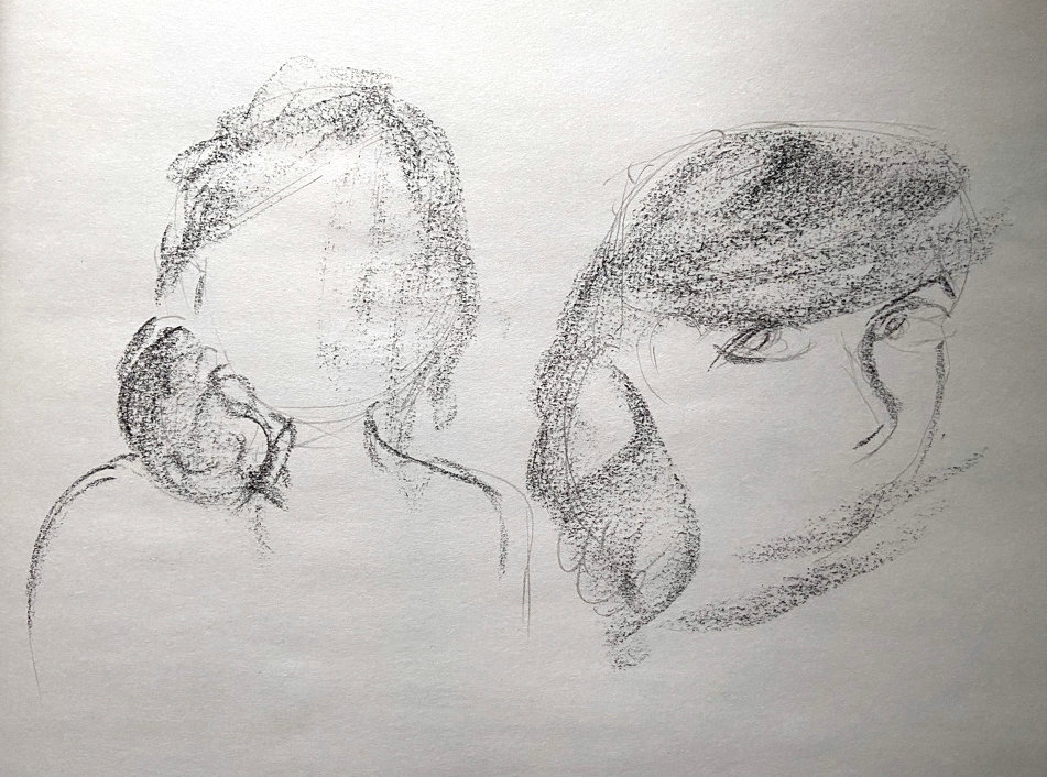 So all over the place this week! I get very stressed when it comes to putting pencil and ink to paper, and I feel like my creativity fell victim to that stress. I see the work you are all creating – and well, there is a lot of measuring myself against others' amazing drawings. The first three drawings are my triptych series. I considered something using the elements earth, air, fire and water. I chose to focus on my hair, as it is the most interesting (I think) physical part of me. My hair made me a target of pre-teen bullies in school, but has always been the part of myself I love the most. The two pieces with runner/walker profiles were a first attempt at the project, but I thought I needed to push the comfort zone a bit and try using ink and charcoal.